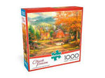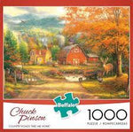 Country Roads Met Me Home est un puzzle de 1 000 pièces de la collection Chuck Pinson, par Buffalo Games. Dans ce puzzle, quelques cerfs blanches, quelques dindes et un beau feuillage d'automne bordent la route de campagne menant à une ferme. La ferme propose une grange rouge classis et son silo à côté d'une ferme jaune pittoresque.