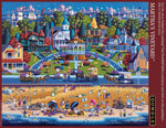 Martha's Vineyard, Massachusetts, est une île située au sud de Cape Cod et est connue pour être une colonie d'été aisée. Dans cette peinture, des bateaux de toutes tailles naviguent devant les "nuages ​​de dowdle" emblématiques. De belles maisons affronteront le bord de l'océan et une variété de personnes apprécient les pique-niques et les activités de plage.