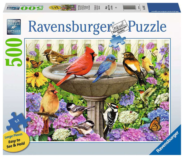 Niché parmi les hortensias multi-teintes et le Rudbeckia jaune ensoleillé, ce joli bain d'oiseaux est l'endroit où des amis à plumes colorés affluent! M. Evening Grosbek semble être sur un rouleau sur quelque chose, tandis que le cardinal du nord et l'oiseau bleu de l'Est attendent patiemment pour obtenir un mot en bordure de bord. Le Sparrow murmura peut-être le papillon des monarques passants, mais l'American Goldfinch vient de prendre un verre rapide et reste en dehors. Amusant pour tous et un puzzle parfait pour tout montre d'oiseau ou amoureux de la nature!