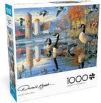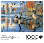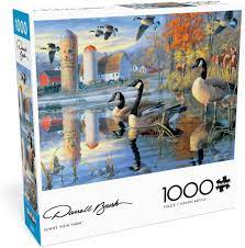 Sunny View Farm est un puzzle de 1000 pièces de la collection Darrell Bush par Buffalo Games. La ferme Sunny View peut être vue au loin. Ce puzzle présente un troupeau d'oies volant au-dessus de l'eau, ainsi que quelques-uns reposant ci-dessous.