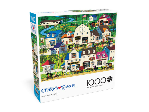 Ce puzzle de 1000 pièces intitulé «Shops and Buggies» est basé sur l'œuvre de Charles Wysocki. Embarquez dans une charmante virée shopping dans ce charmant puzzle capturant une ville pittoresque...