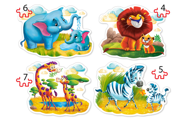 Quatre puzzles contastés séparés représentant différents animaux de la savane et de leurs enfants. Mettez ces puzzles avec votre propre petit.