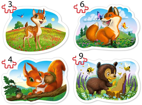 Un ensemble de quatre puzzles contastés différents représentant des animaux de la forêt - un cerf, un renard, un écureuil et un ours.