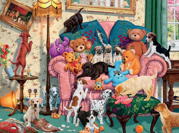 Des chiots à la maison sautant sur la chaise de grand-mère et jouant avec ses ours en peluche.