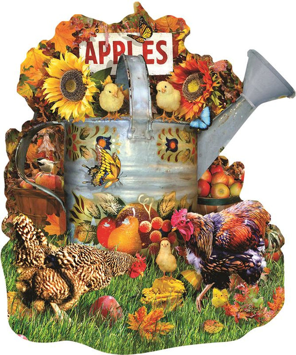 Un paysage de filles et de coqs dans un jardin avec de belles couleurs d'automne