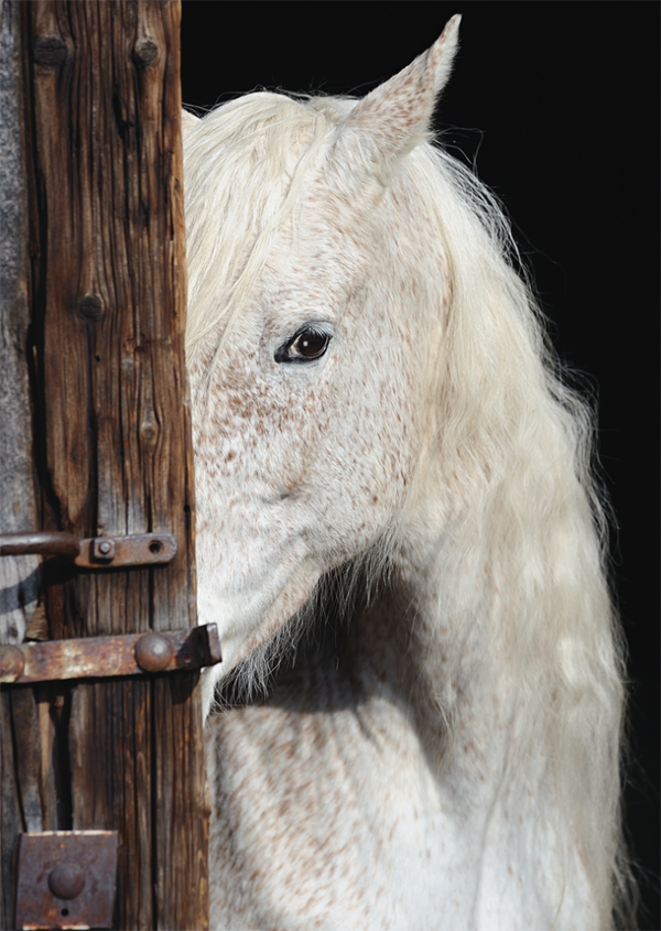 Un beau cheval pommelé avec une crinière de blanc pur vous regarde derrière la porte de la grange.