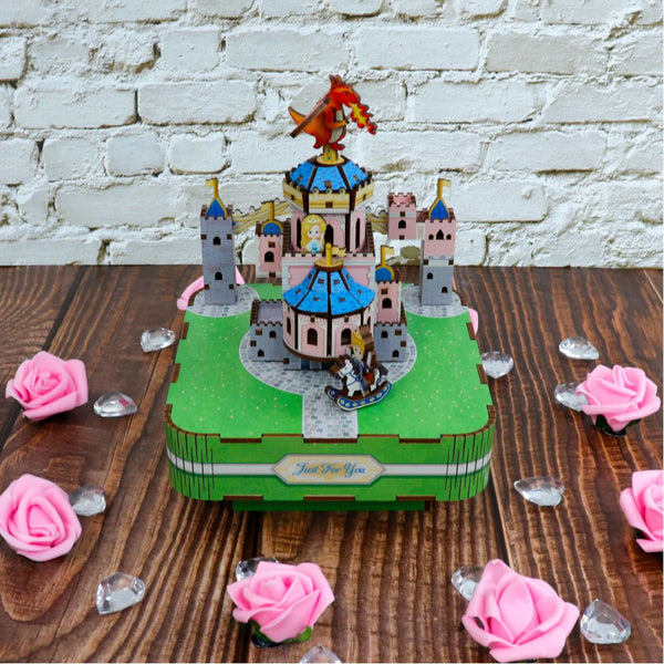 Boîte de musique rotative de puzzle 3D bricolage  Niveau de difficulté: 5/5 Taille assemblée: 140 x 140 x 160 mm 115 PCS Chaque boîte contient: - Plaques en bois précoce...