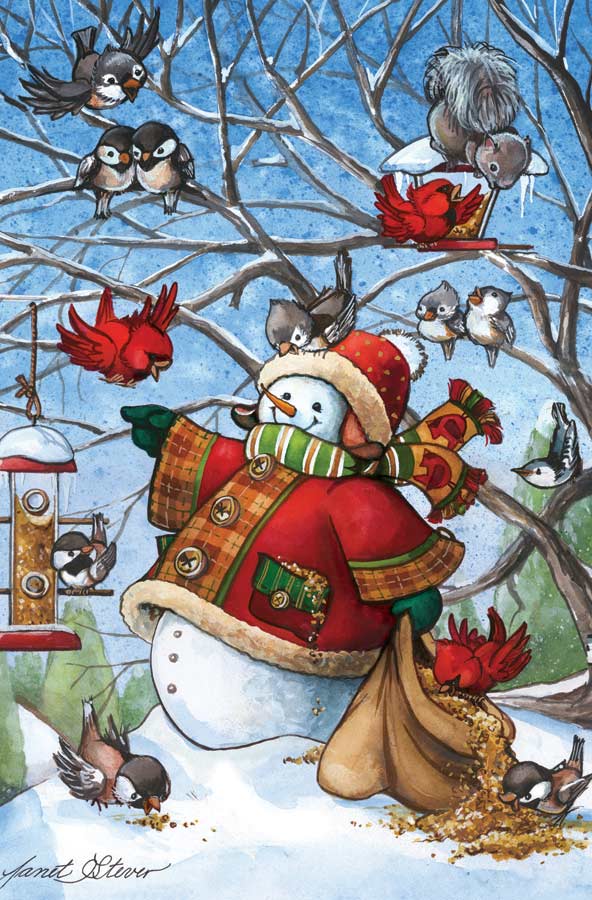Un bonhomme de neige à l'extérieur dans la neige se nourrissant et jouant avec ses amis.