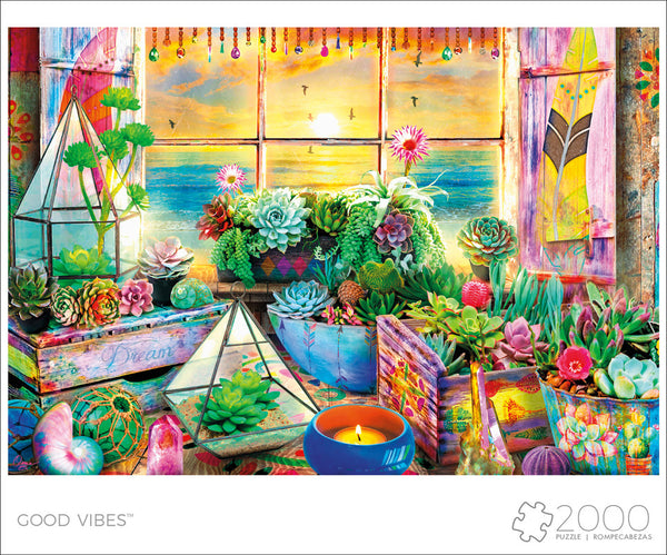 Ce puzzle de 2000 pièces intitulé Good Vibes propose un jardin succulent relaxant. Passez un peu de temps à méditer ou à regarder par la fenêtre l'océan dans cet espace confortable rempli de bougies, de plantes et de cristaux. C’est de bonnes vibrations uniquement dans ce puzzle.