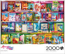Ce puzzle de 2 000 pièces, intitulé Travel Bazets, est de l'artiste Aimee Stewart. Cette étagère pleine de photos et d'autres bibelots de voyage dans un gradient arc-en-ciel qui est...