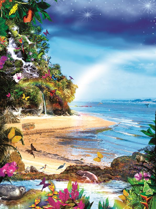 Une belle scène calme d'une plage avec des papillons colorés, des fleurs, une cascade et des phoques se sont effondrés sur le rivage.