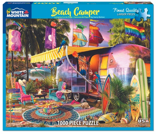 Le camp est mis en place pour la saison. Le chiot se repose après une journée bien remplie dans le sable. Le soleil se couche par une autre journée parfaite de surf et de cerf-volant. Il est temps de s'asseoir près du feu et de profiter de quelques smores tandis que le soleil jette de belles nuances de rose et de violet dans le ciel. L'artiste Garry Walton donne vie au camping sur la plage
