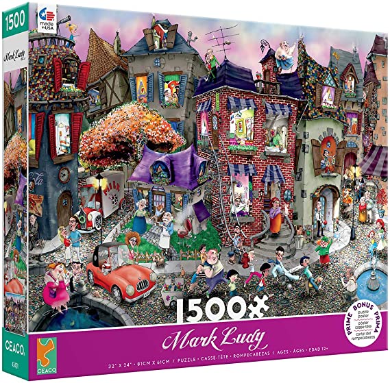 Ce puzzle d'art de dessin animé de 1500 pièces de Mark Ludy présente une scène de rue festive avec une fontaine et des rues pavées.