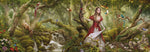 Une femme traverse une forêt verte enchanteresse entourée d'oiseaux.