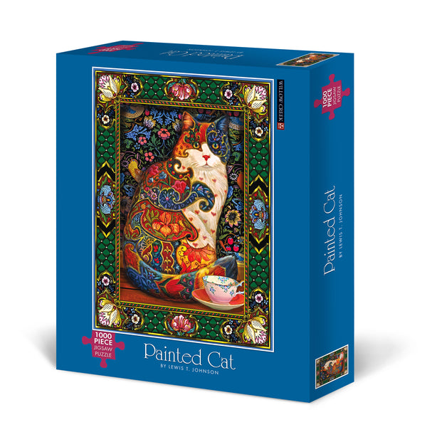 Opulent et ornemental, cette peinture très détaillée de Lewis T. Johnson propose un chat tabby élégant et une tasse de thé représenté dans un style décoratif de cloisonne. Une tapisserie florale est tissée sur tout le fond, encadrée par une bordure ornée.