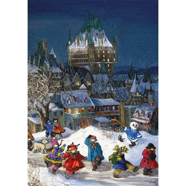 Les enfants jouent dans la neige avec les fenêtres du château de Frontenac de la ville de Québec brillante au loin, telle que peinte par l'artiste canadienne Pauline Paquin.