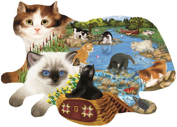 Les amoureux des chats adoreront ce puzzle en forme de chat de 1000 pièces. À l'intérieur, il contient des images de chats jouant près de l'eau.