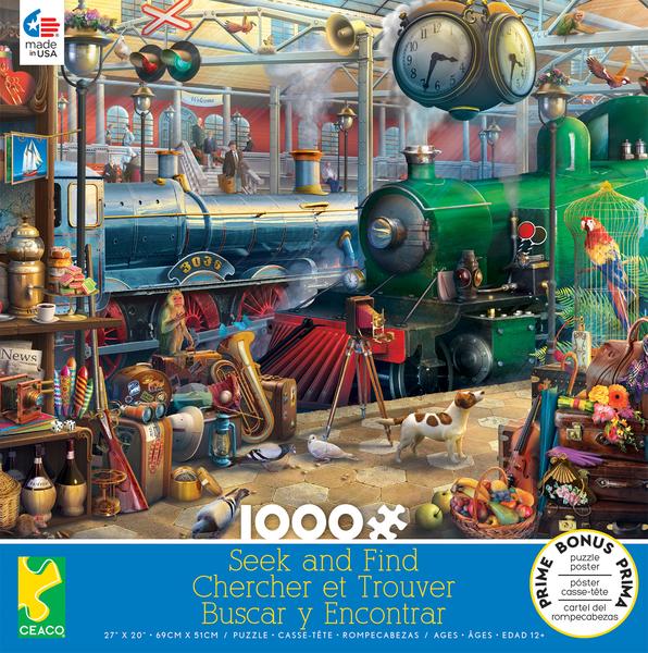 Ce puzzle de 1000 pièces présente une illustration chargée d'une gare.