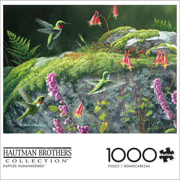 Dappled Hummingbirds est un puzzle de 1000 pièces de Buffalo Games et une partie de la collection Hautman Brothers. Profitez de reconstituer un rocher couvert de mousse lorsque des colibris flottent près des fleurs colorées du rose et du violet. La collection Hautman présente des beaux-arts inspirés par la nature! Les Hautman Brothers se sont imposés comme la principale famille des artistes fauniques américains. Hautman Brothers Art a été présenté sur plus de 41 timbres d'État et fédéraux et affichés à la fois dans le Smithsonian Institute et l'Oval Office.