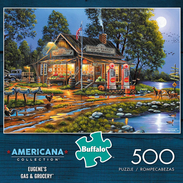 Ce puzzle de 500 pièces intitulé Eugene’s Gas & Grocery est de l'artiste Geno Peoples et fait partie de la collection Americana de Buffalo Games.