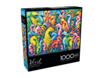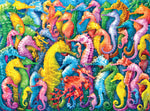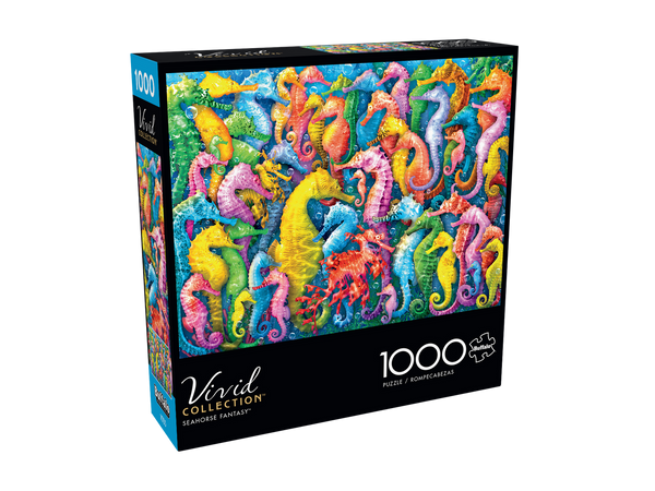 Ce puzzle de 1000 pièces de Buffalo Games s'intitule Seahorse Fantasy et est basé sur des illustrations d'Eduard. Les hippocampes remplissent toute la scène, colorée dans une variété de jaunes, de bleus, de rouges, de verts et de violets vibrants.