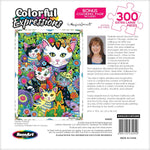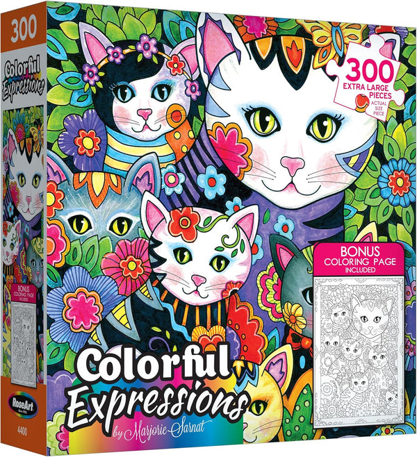 Colorful Expressions 300XL piece jigsaw puzzle "Family Portrait" by NY Times best-selling coloring book author Marjorie Sarnat, features a colorful family of felines amongst the flowers. Made from sturdy premium puzzle board, you will feel the weight and quality in every piece. Each piece is fully interlocking and has a beautiful "snap" as you assemble the puzzle. Bonus coloring book page included.
