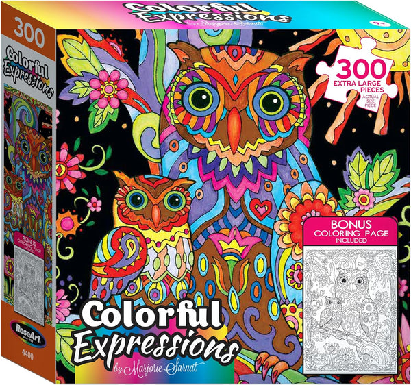 Colorful Expressions 300XL piece jigsaw puzzle "owl and baby by night" by NY Times best-selling coloring book author Marjorie Sarnat, features a colorfully patterned mother owl and her baby. Made...