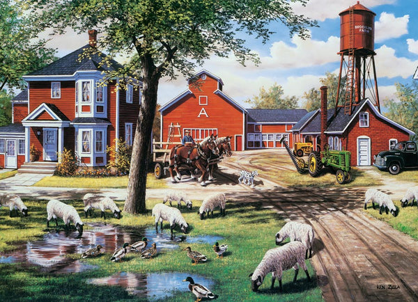 Les compagnons de ferme sont une image pittoresque avec des moutons, des chevaux, des canards et des granges. Grande composition et palette de couleurs!