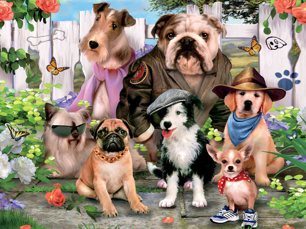 Ce puzzle présente des chiens adorables déguisés en "mecs sympas".