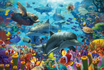 Profitez des merveilles de la mer de corail avec des tortues, des dauphins, des requins, du poisson, des rayons manta et la beauté du bleu de l'océan profond dans ce puzzle de 2000 pièces.