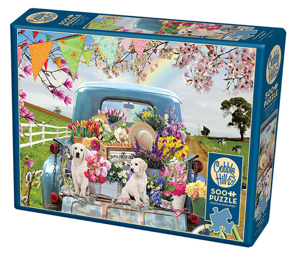 Le camion de campagne au printemps est plein de couleurs avec de belles fleurs, rubans et arcs-en-ciel! Un puzzle joyeux de 500 pièces équipé de chiots câlins.