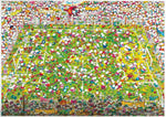 Ce puzzle avec l'art de la caricaturiste Guillermo Morlier présente un fan de fan et un joueur de football et un look rempli de joueur de football sur la Coupe du monde.