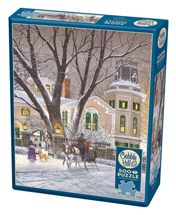 C'est une nuit enneigée pour une balade en traîneau tirée sur des chevaux et Mme Abinante hésite à laisser le chien derrière. Les puzzles de 500 pièces de Cobble Hill...