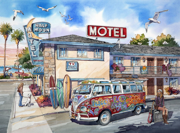 Un campeur de Volkswagen Westfalia arrive dans un motel en bord de plage pour que ses occupants surfoncent les vagues et rockent la paix et l'amour.