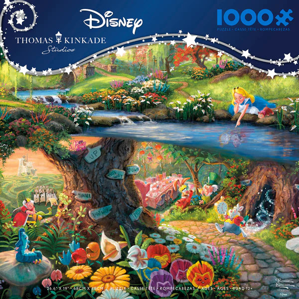 Ce puzzle de 1000 pièces Disney Thomas Kinkade présente Alice, d'Alice au pays des merveilles, en regardant son reflet dans une rivière. À l'insu de elle, sous l'eau, toute la...