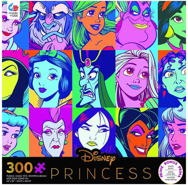 Ce coloré; 300 pièces surdimensionnées Disney Puzzle propose un collage de princesses et de méchants de films Disney dans un style pop art, dont Snow White, Ursula et bien d'autres.
