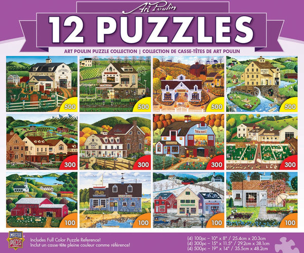 Cette boîte est endommagée Comprend (4) des puzzles de 100 pièces, (4) puzzles de 300 pièces et (4) 500 puzzles Affiche à couleurs complètes dépliante avec les 12 images