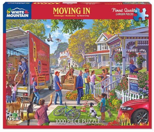 Sortez et accueillez les nouveaux voisins dans le quartier. Les enfants regardent les déménageurs décharger le camion et la petite fille atteint sa maison de poupée. L'artiste Steve Crisp vous aide à découvrir la joie d'un nouveau départ dans ce puzzle de 1000 pièces. Taille finie 24 "x 30".