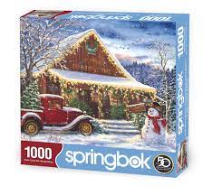 Allez trouver votre arbre de Noël parfait au "Lazy Creek Country Store". Ce puzzle de 1000 pièces est les puzzles de Noël parfaits, avec une merveilleuse illustration d'un magasin country vintage avec des couronnes et un bonhomme de neige à l'avant.