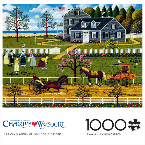 Boîte endommagée Ce puzzle de 1000 pièces intitulé «The Bocce Ladies of Martha’s Vineyard» est basé sur l'œuvre de Charles Wysocki. Dans la cour avant d'une maison de Cape Cod...