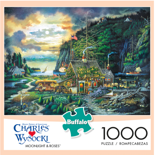 Boîte endommagée Un salon de restauration pittoresque recouvert de roses brille au clair de lune d'une ville endormie de la Nouvelle-Angleterre, dans ce puzzle de 1000 pièces, Moonlight & Roses,...