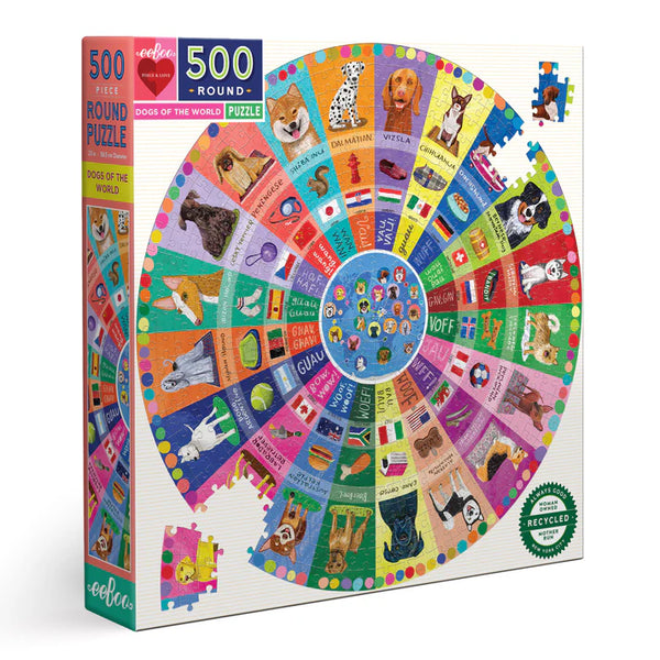 Dogs of the World 500 pièces rondes pour adulte puzzle pour adulte fera le wag de la queue de tout le monde! Vingt races de chiens différentes du monde entier sont présentées dans ce puzzle familial. Chaque race a son propre ruban de couleur qui fournit le nom de la race, le drapeau de son pays natal, comment vous dites «woof» ou «guau» dans la langue de ce pays. De plus, une bague qui montre toutes les choses que les chiens aiment jouer avec, utiliser ou poursuivre…. Une pantoufle, une balle, un écureuil et beaucoup plus. Laissez les enfants trier les pièces par couleur, puis terminez chaque section ensemble en famille. Un cadeau parfait pour un amateur de chien!