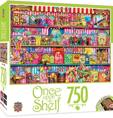 Ce puzzle de 750 pièces comprend des "étagères" de gâteries colorées avec un bord vintage, y compris la taffy, les sucettes, les bâtons de menthe poivrée, et plus encore! Puzzle bonus inclus dans l'application gratuite!