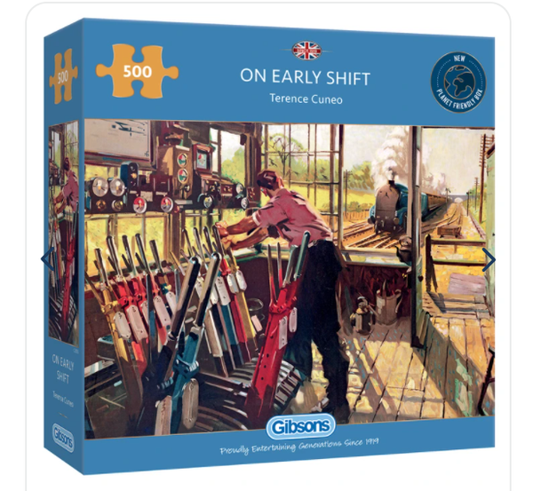 Ce charmant puzzle de 500 pièces représente l'une des toutes premières affiches de chemin de fer créées pour les nouveaux chemins de fer britanniques en 1948. Illustré par l'artiste talentueux Terence Cuneo, il présente l'intérieur du signal occupé et un seul homme de Greenwood à New Barnet, avec une locomotive à vapeur A4 Pacifique.