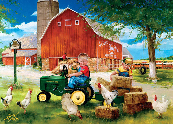 Cette image montre un petit garçon chevauchant le tracteur pédale de la série John Deere 30. Il a été peint par l'artiste talentueux, Donald Zolan, dont les images de ferme...