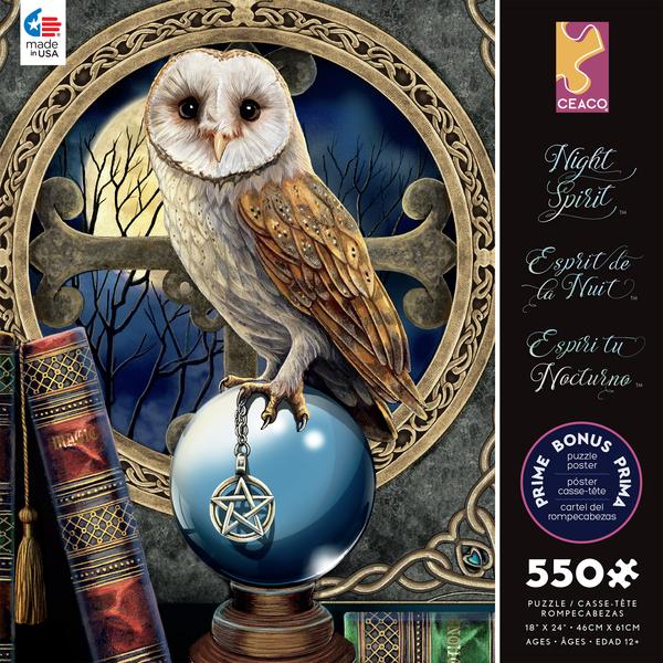 Ce puzzle de 550 pièces de l'artiste, Lisa Parker, représente un hibou debout sur une boule de cristal.