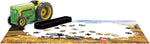 Un tracteur en forme verte vintage avec puzzle et affiche. À travers les terres agricoles rurales, une image bien reconnue. Puzzle est une scène de ferme paysager nostalgique.