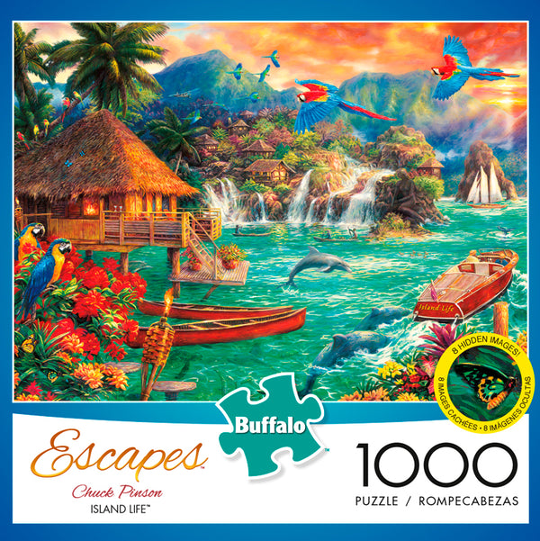 Échappez aux îles avec ce puzzle de 1000 pièces basé sur l'œuvre d'art de Chuck Pinson. La «vie insulaire» de Pinson présente des favoris du paradis tropical, comme une cabane...