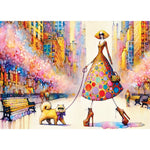 Entrez dans une scène de radiance printanière avec ce puzzle captivant, avec une femme en couture dynamique se promenant dans une ville ensoleillée ornée d'arbres en fleurs. Sa tenue colorée,...