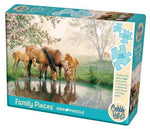 La famille des chevaux prend un verre d'eau par leur arbre préféré près de l'étang en cet après-midi brumeux dans le pâturage. Ce puzzle de Family Piece 350 comprend des pièces grandes, moyennes et petites qui en cascade de haut en bas, donc les perplexes de tous les niveaux de compétence peuvent contribuer au plaisir